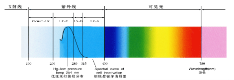 紫外線通指是波長在100-400nm的電磁波,人的眼睛不能看到紫外線。100-400nm波長的紫外線,按其對人體的影響及功能,UV-A,UV-B,UV-C和V-UV。 UV-A是指波長在315-400nm的紫外線,UV-A能使人的皮膚產(chǎn)生黑色素,使皮膚變黑。 UV-B是在波長在280-315nm的紫外線,UV-B能致癌,令皮膚起皺紋老化。 UV-C的波長在200-280nm,其中有254nm波段有殺菌、消毒效能。 波長在240-270nm的UV-C能直接破壞細胞、病毒的DNA(脫氧核糖核酸)和RNA(核糖核酸),使微生物迅速死亡。 波長在100-200nm的V-UV185nm能產(chǎn)生臭氧,而在空氣中或溶解在水中的臭氧,能把微生物的細胞壁以氧化作用破壞,使微生物立刻死亡。
