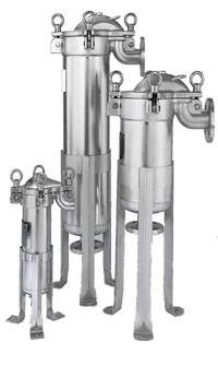 袋式過濾器是通過濾袋,在壓力的作用下,使原液通過濾袋,由被支撐濾藍支撐的過濾袋頂部流入,這使得物料在整個過濾表面能得到均勻分布,過濾介質中流線分布是一致的面,沒有紊流的負效應。液體從過濾袋內流向袋外,濾出的顆粒雜質被截留在過濾袋內部,使得更換過濾袋時不致污染下游的液體,同時也使過濾系統清洗方便。設計在過濾袋內的提手使更換濾袋快速便捷。支撐濾籃的尺寸可由高強度鋼板沖孔制造,也可由不銹鋼絲網而成,這給袋式過濾系統提供了一個大而暢通的過濾表面,從而保證了過濾系統流量大,體積小,防止過濾袋纖維遷移,保證了很高的過濾效率。過濾袋的過濾介質主要有表面過濾網狀材料,深層過濾針氈材料和深層吸附材料。在過濾袋內可安裝專用磁棒或放置活性炭、硅藻土,以去除鐵性雜質或吸附有機物。