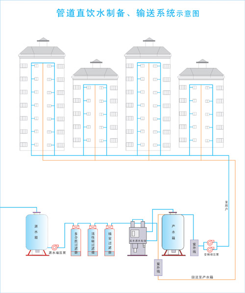 四、管網(wǎng)水循環(huán)消毒設(shè)備 管道分質(zhì)供水必須做到“打開(kāi)龍頭即能生飲”。除了要做到優(yōu)質(zhì)飲用水設(shè)備出口水質(zhì)達(dá)標(biāo)外,必須在管網(wǎng)上設(shè)置管網(wǎng)水定時(shí)循環(huán)消毒裝置這樣才能確保管網(wǎng)水的衛(wèi)生安全,有效防止二次污染。