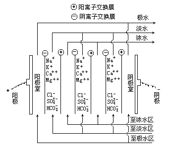 將溶液置于直流電場中,它所含的帶電離子就向帶相反電荷的電極移動。如果在溶液中裝設離子交換樹脂膜將溶液隔開成幾部分,這些膜會選擇性地讓某些離子通過,而將另一些離子阻擋住。這樣就使被樹脂膜隔開的某些部分含電解質較多,而另外的部分則相反。這就是電滲析作用,藉此可以分離和除去溶液中的電解質,即將溶液脫鹽。 電滲析所用的離子交換樹脂膜有兩類:一類只能透過陽離子,簡稱為陽膜,它通常含有帶負電的活性基團,能透過陽離子,但它的負電基則將溶液中的負離子排斥在外并阻擋其通過。另一類膜只能透過陰離子,簡稱陰膜,它通常含有帶正電的活性基團,能透過陰離子,但排斥和阻擋陽離子。將陽膜和陰膜交替排列成多個組合,兩側置電極,就成為電滲析器。 在電滲析器的兩端裝陽極和陰極,中間交替地平行放置陽膜和陰膜。在通入直流電后,溶液中的離子受相反電荷的電極吸引而相它移動,陽離子透過陽膜而被陰膜所阻擋,陰離子透過陰膜而被陽膜所阻擋。這樣在陽膜與陰膜之間就積聚較多的電解質,成為濃縮液,該室就是濃縮室;而在陰膜與陽膜之間則較少離子,成為淡化液,該室就是淡化室。 在電滲析器的陽極發生幾種化學反應,Cl-和OH-放出電子,形成初生態氯和氧,放出氯氣和氧氣,一些氯溶于水中生成次氯酸使水呈酸性。 在電滲析器的陰極發生另幾種化學反應,H+ 和Na+吸收電子,形成氫氣和氫氧化鈉,使溶液呈堿性。 溶液中存在的其他離子亦發生相應的反應,如Ca2+、Mg2+生成Mg(OH)2和CaCO3等沉淀物。 電極反應消耗的電能為定值,與電滲析器中串聯多少對樹脂膜的關系不大,為充分發揮電流的脫鹽作用,常在兩電極之間串聯裝置很多對膜,一般為200~300對,甚至多達1000對(膜對多時要用較高電壓)。 在電滲析器通入直流電后,淡化室中的鹽類濃度逐漸降低(以至趨近于零);濃縮室中的鹽類濃度則逐漸升高。將各個淡化室的液體引出,是含電解質很少的溶液;各濃縮室的液體引出,是集中了鹽類的溶液。兩端電極的液體引出混合,使它們互相中和。 二、電滲析工程典型工藝流程 1、苦咸水淡化、地下水除氟原水→101過濾器→精密過濾器→電滲析裝置→中空纖維超濾器→紫外線殺菌器→成品水 2、飲用純凈水、太空水生產 原水→機械過濾器→活性炭過濾器→精密過濾器→電滲析裝置→陽離子交換器→陰離子交換器→混合離子交換器→中空纖維超濾器→紫外線殺菌器→臭氧滅菌裝置→成品水 3、制藥行業針劑制備、大輸液制備用水 原水→活性炭過濾器→精密過濾器→電滲析裝置→陽離子交換器→陰離子交換器→混合離子交換器→多效蒸餾水機→成品水 4、化肥、機械行業用水 原水→機械過濾器→精密過濾器→電滲析裝置→陽離子交換器→脫氣塔→陰離子交換器→成品水 三、a)離子交換膜的種類和特點 離子交換膜是電滲析器的關鍵部件。它的化學結構與一般的離子交換樹脂相同,分為基膜和活性基團兩大部分。基膜是具有立體網狀結構的高分子化合物,活性基團是由具有交換作用的陽(或陰)離子和與基膜相連的固定陰(或陽)離子所組成。 陽膜的材質通常是磺酸型樹脂,活性基團為強酸性的磺酸基-SO3H,它容易離解出H+。陽膜表面有大量的負電基SO3-,故排斥溶液中的陰離子。 陰膜的材質通常是季胺型樹脂,活性基團為強堿性的季胺基-N(CH3)3OH,它容易離解出OH-。陰膜表面有大量的正電基-N(CH3)3+ ,故排斥溶液中的陽離子。 基膜的立體網狀結構的高分子骨架中存在許許多多網孔,這些網孔相互溝通形成微細的、迂回曲折的通道,通道的長度遠大于膜的厚度。在電場作用下,溶液中的陽離子可通過陽膜的微細孔道進入膜的另一側(向陰極方向),陰離子則通過陰膜進入相反的另一側(向陽極方向)。電滲析器中有許多陽膜和陰膜交錯排列,配對成許多個組合。在每一對陽膜和陰膜之間,離子從它的兩側進入,就形成離子集中的濃縮室,而在它的外側就形成淡化室。 上述兩類膜統稱為通用膜,是用得最多的。它的缺點是不耐氧化和高溫。在兩端的電極室,溫度較高且有氧化反應,要用特殊材料的離子交換膜、惰性多孔膜或纖維布。 此外還有兩性膜,它是將磺酸基團和季胺基團按適當比例混合制得。兩性膜具有較好的抗極化性能(而普通陰膜易因極化作用使電阻和電壓升高,效率下降)。 通常使用的陰膜為苯乙烯季胺型樹脂,較易被水中的有機物污染,使電滲析效率下降。大孔陰膜(膜孔徑為0.05~0.15μm)具有一定的抗污染能力。 離子交換膜按膜體結構分為異相膜、均相膜和半均相膜三大類。異相膜亦稱非均相膜,是直接用磨細的離子交換樹脂(250目),加入粘合劑制成。其中含有離子交換活性基團的部分與形成膜狀結構的部分有不同的化學組成,活性基團分布不均勻。這種膜工藝成熟,價格較低,但粘合劑有將活性基團包住的傾向,膜電阻較大,選擇透過性較低。膜的厚度較大,約0.4~0.8mm。 均相膜不含粘合劑,通常是在高分子基膜上直接接上活性基團,或用含活性基團的高分子樹脂的溶液直接制得。這種膜中的活性基團分布均勻,膜的整體結構均一。它的厚度小,約0.15~0.3mm,電化學性能好,但價格較高。半均相膜是將離子交換樹脂和粘合劑同溶于溶劑中再形成膜。外觀、結構和性能都介于上述兩種膜之間。 國外生產的離子交換膜的品種很多,國內生產的品種亦迅速發展
