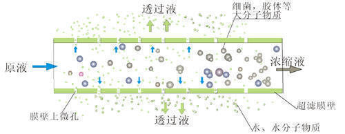 超濾是一種不對稱半透過薄膜,常用材料有醋酸纖維素膜(CA)、聚砜膜(PS)、聚丙烯膜(PAN)等。在一定的壓力下,水在膜表面上流動,水與溶解鹽和其它電解質(zhì)等微小顆粒能透過超濾膜,而蛋白質(zhì)、各類酶、細(xì)菌、病毒、乳膠、熱源與其它分子量大的顆粒和膠體物質(zhì)被超濾膜阻擋,從而使水中的部分微粒得到分離、濃縮。超濾膜孔徑為 0.1-0.002µm ,介于反滲透與微孔膜之間。 超濾裝置是根據(jù)生產(chǎn)的要求,采用相應(yīng)截留分子量的超濾膜進(jìn)行工藝流程設(shè)計(jì)。超濾分離在常溫、低壓下運(yùn)行無相態(tài)變化,膜不易阻塞,操作極為方便。