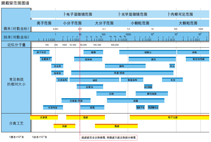 超濾膜的微孔徑在0.002-0.1μm之間,超濾膜分離過程是一種與膜孔徑大小相關(guān)的篩孔分離過程,以膜兩側(cè)的壓力差為驅(qū)動力,以超濾膜為過濾介質(zhì),即在一定壓力作用下,當(dāng)含有大、小分子溶質(zhì)的混合溶液流過膜表面時(shí),溶劑和小分子溶質(zhì)(如無機(jī)鹽類)將透過膜。大分子溶質(zhì)則由于體積大于膜孔徑而被膜截留,作為濃縮液被回收。因而實(shí)現(xiàn)對原液的凈化、分離和濃縮的目的。參見上圖。 原液一般指需要凈化、分離或濃縮的溶液,透過液指原液中透過超濾膜而被濾除大分子溶質(zhì)的那部分液體,濃縮液則是原液中因分離出透過液而剩余的高濃度溶液。在凈化水工程中,原液是指原水進(jìn)水,透過液即為凈化水,濃縮液則是排放的廢水。 二、超濾膜的參數(shù) 從下表中可以看出,在膜法分離技術(shù)中膜的微孔徑在0.002-0.1μm之間的過濾膜稱為超濾膜,而一般膠體體積均≥0.1um,乳膠≥0.5um,大腸菌、葡萄球菌等細(xì)菌體積≥0.2um,懸浮物、微粒子等體積≥5um,因此超濾膜可以過濾出溶液中的細(xì)菌、膠體、懸浮物、蛋白質(zhì)等大分子物質(zhì)。