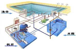 游泳池內的水先進入毛發聚集器,去除池水中較大顆粒固體雜質、毛發、纖維和樹葉,即預凈化。而后,水流與泵前加入的混凝劑溶液一起流入循環工作泵,充分混合并加壓后,進入機械過濾器。絮凝后的小顆粒懸浮物被濾網截留,過濾后的水經過濾器底部流出,經消毒后的水趨勢進入換熱器,經過加熱再回到游泳池。如此反復循環,使游泳池水得到凈化。